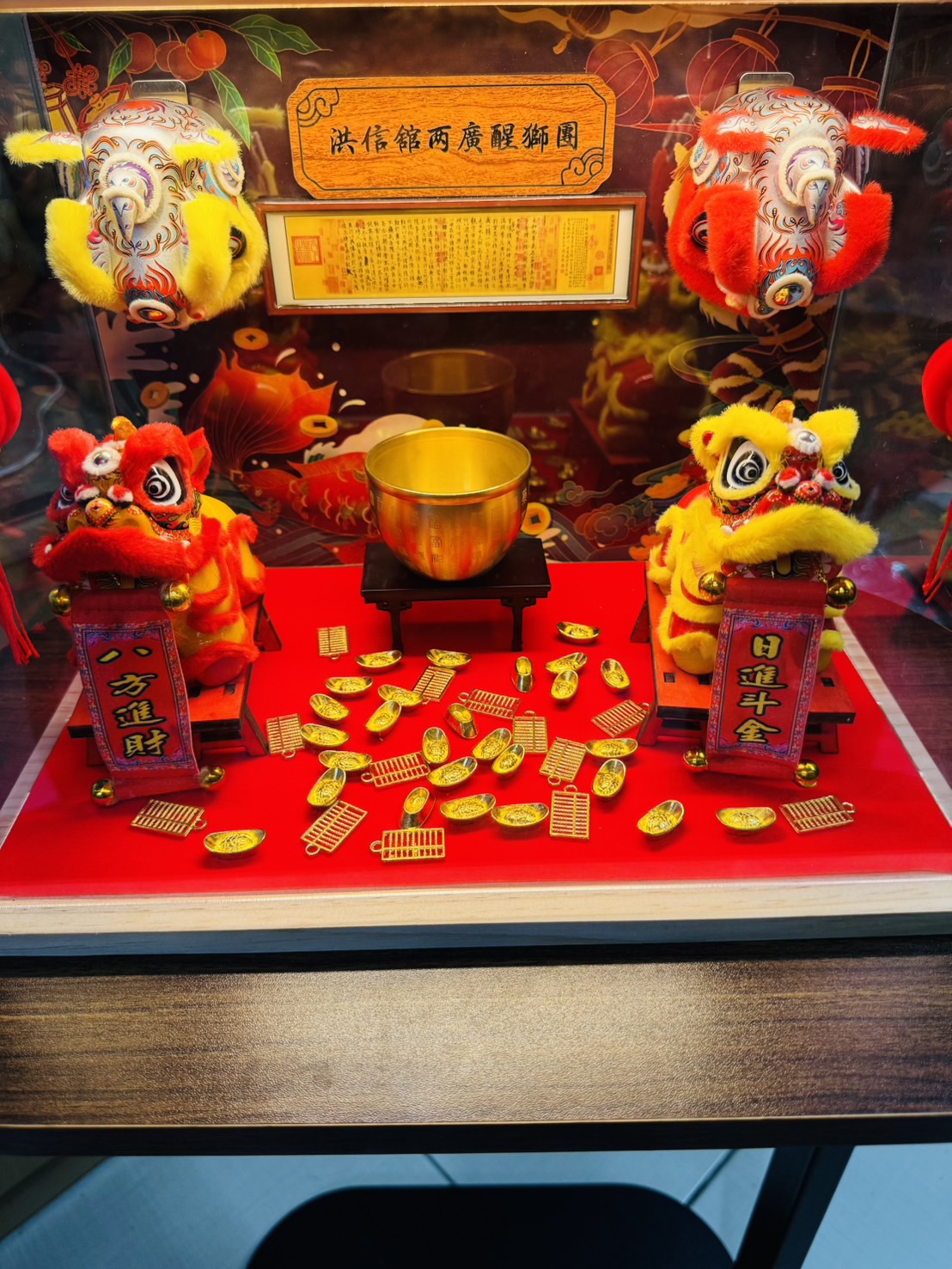 2.迷你神台+純銅佰福杯+些許鎏金元寶+迷你蘭亭序牌匾