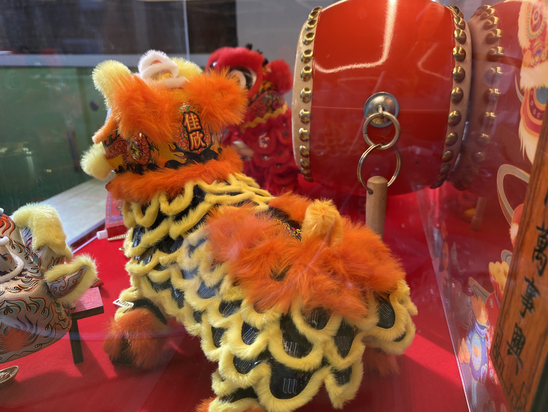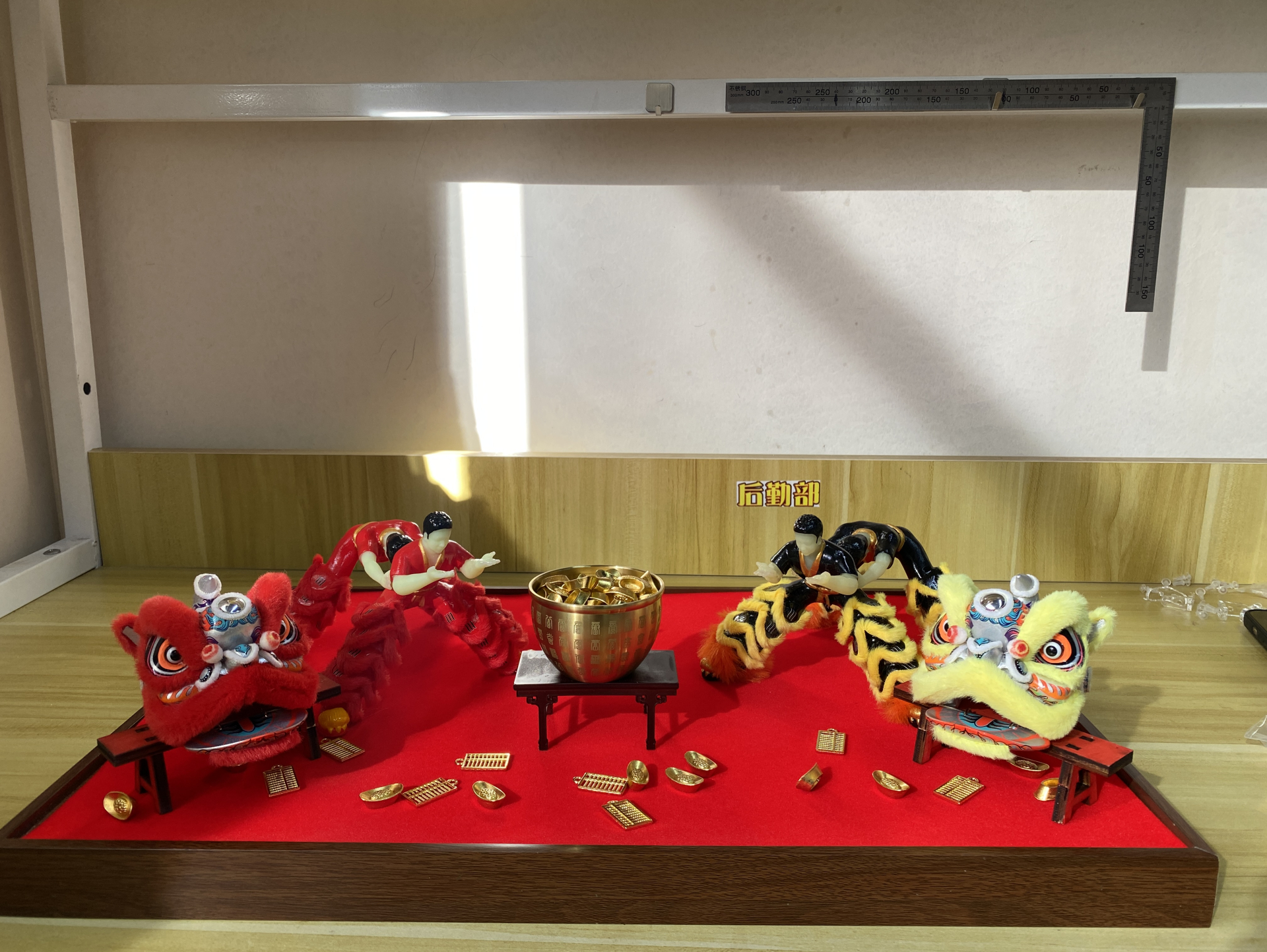 1.兩隻站立款舞獅(帶人偶)尺寸:長23公分*寬11公分*高15公分,兩隻8公分獅頭(黃、紅)
